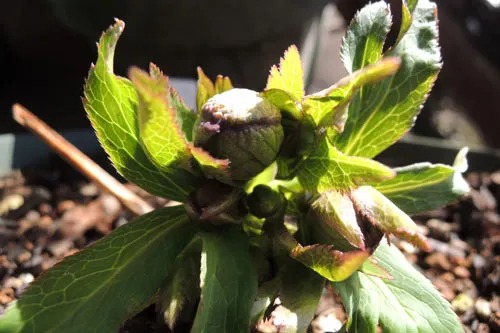 一番の楽しみは、3年前に3号ポットで購入した原種ヘレボレスアトロルーベンスに花芽が上がったこと