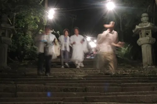 ようやく鳥居が見えてきた頃には朝御饌祭(あさみけさい)を終えた氏子たちの姿、、、