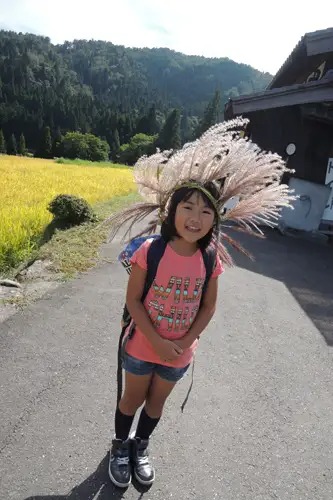 ススキとチカラシバで造った冠をかぶる可愛い子ちゃん