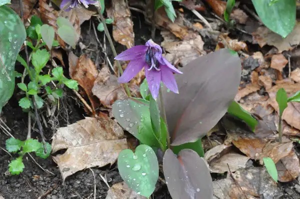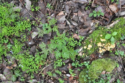 山に咲くイカリソウやイチゲの葉を見つけながら、下りは早い