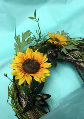 最近のお届けリースの中から、向日葵のリースのご紹介(アイフォンからの撮影で画像が荒くてすみません