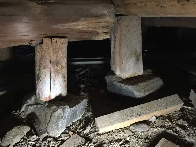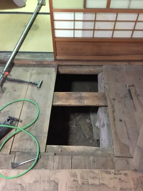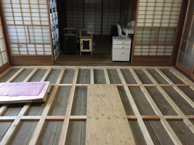 酷い雨漏りでたたみは腐っていたので取り払い、敷居が下がっていたので長いほうをジャッキアップで切り取りました。