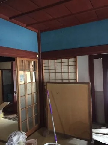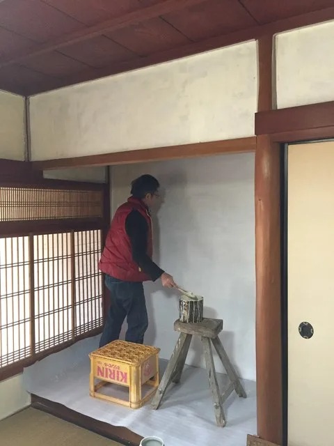 新橋ブルーと呼ばれる色のじゅらく壁は暗いので漆喰の壁に塗り替えました。