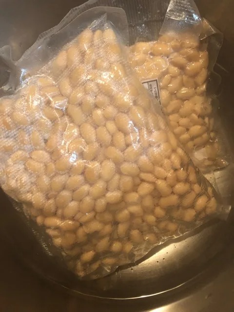 レトルトパックの大豆を潰しやすい様に湯煎しました。