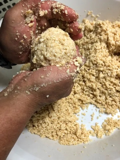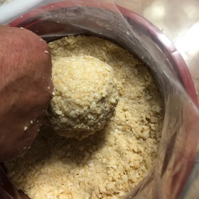塩きり麹と潰した大豆を耳たぶくらいの柔らかさになる様に良く混ぜます。硬い様なら200ccの塩水を入れます。