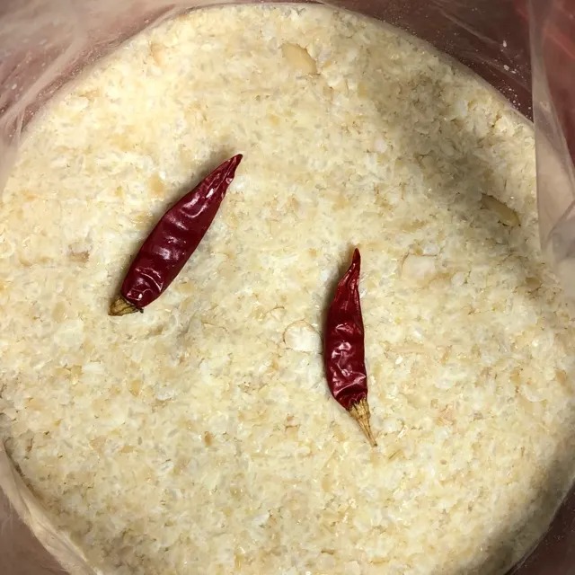 詰め終わったら唐辛子🌶をカビ避けの為にのせます