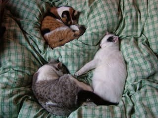 ミケとてんちゃんとちょろの寝姿。我が家の女王様、はなちゃんだけはいつも別行動です。