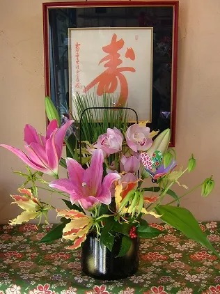 お正月のアレンジのご注文でした。バックの寿は大覚寺の前門跡良戒氏の書です。