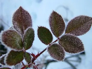 散り残った薔薇の葉が、凍りついてとても綺麗です。