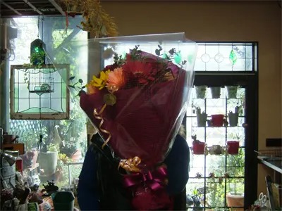 親戚のおばさんの還暦祝いの花束だそうで、作るのを待ってもらっている間にいろいろお話聞きました。