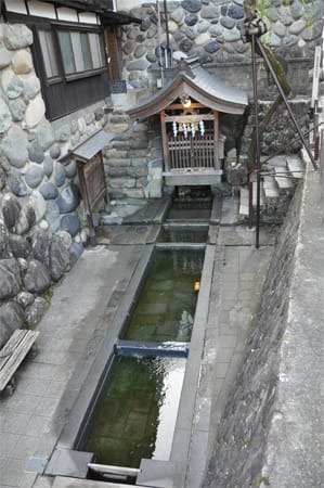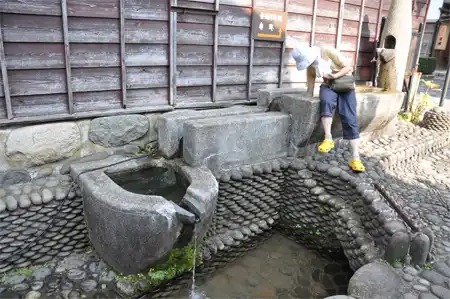 日本名水百選認定第一号だそうですが石の間から湧く地下水に見学に来た観光客の足元は水際まで浸かってます。